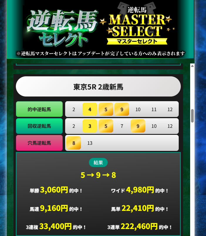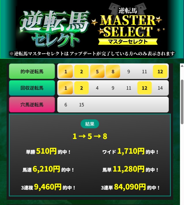自分のやり方を信じてきて実りました。先週逆転場セレクトで3連単22万馬券を取れました。1点100円かけで22万ちょっとの配当でしたけど満足です。引き続き研究していきます。この的中をきっかけに自分はアップグレードして逆転馬マスターセレクトを契約しました。今週も勝ちにいきます。