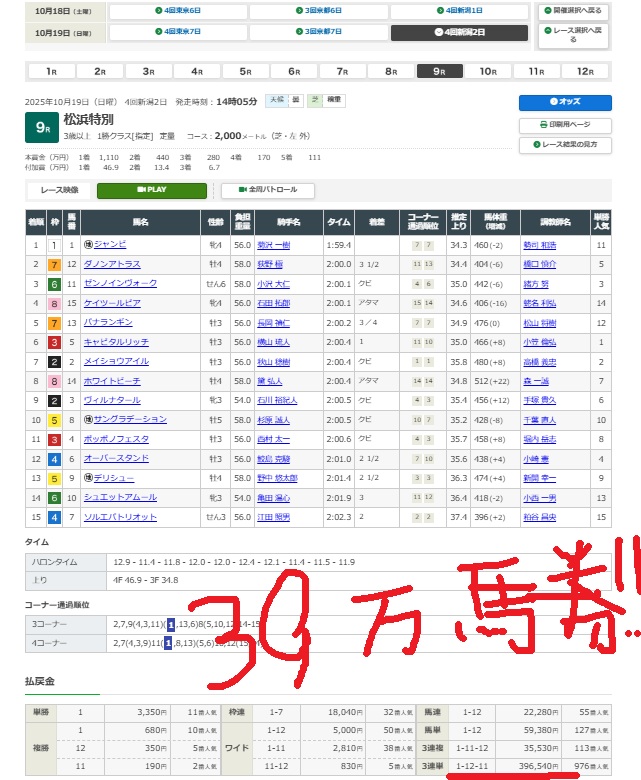10月19日、逆境ファンファーレの逆転馬セレクトを使って、競馬歴5年目、3965.4倍という過去最高倍率を的中できました!他のサイトは無料でも当たって数千円でしょ?逆境ファンファーレの逆転馬セレクトは何といっても無料で使えるのが最高です!!!!!!